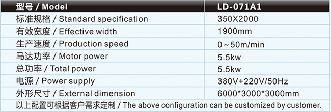 | 汽車用品復(fù)合機(jī)/貼合機(jī)-簡(jiǎn)單型火焰復(fù)合機(jī)/貼合機(jī)LD-071A1主要技術(shù)參數(shù) / Major technical parameters |