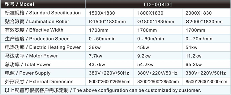 | 皮革復合機/貼合機-白膠強力膠兩用復合機/貼合機LD-004D1的主要技術參數 / Major technical parameters |
