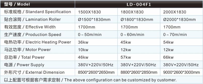 | 包裝材料復(fù)合機/貼合機-紙品復(fù)合機/貼合機LD-004F1的主要技術(shù)參數(shù) / Major technical parameters |