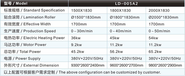 | EVA復(fù)合機(jī)/貼合機(jī)-強(qiáng)力膠復(fù)合機(jī)/貼合機(jī)LD-005A2的主要技術(shù)參數(shù) / Major technical parameters |