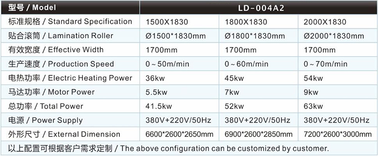 | 地板保護(hù)膜復(fù)合機(jī)/貼合機(jī)-立式單槽水膠網(wǎng)帶復(fù)合機(jī)/貼合機(jī)LD-004A2主要技術(shù)參數(shù) / Major technical parameters |